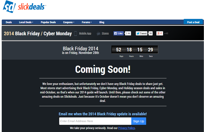 Though the merchants deals may not yet be available consider giving the start with a teasing campaign. Create a Black Friday, Cyber Monday or Christmas Sales 2014 page on your website, make it visible and invite your website visitors to subscribe to a special emailing list that you can then use for specific campaigns.